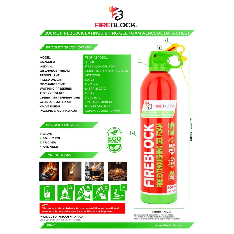 This once-off 800ml aerosol canister is capable of combating Lithium-ion battery fires, Class A, B, C, and F fires, making it the ultimate versatile fire safety solution by smothering the fire and preventing reignition.